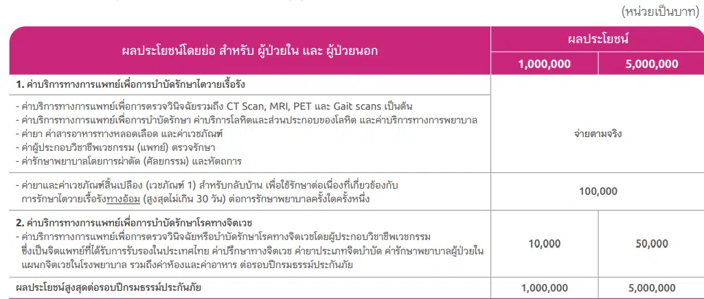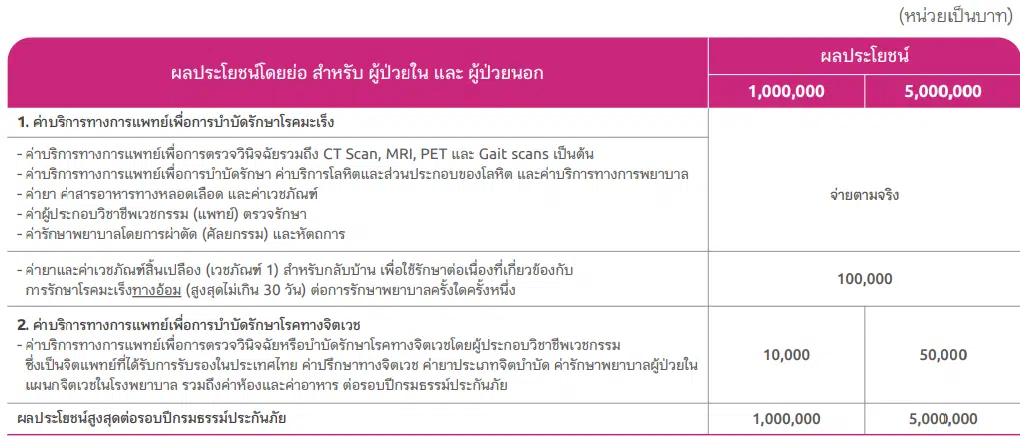 สัญญาเพิ่มเติมนี้ ภายใน 5 ปีกรมธรรม์ประกันภัยนับแต่ปีกรมธรรม์ที่ผู้เอาประกันภัยเริ่มได้รับการรักษาโรคมะเร็งหรือไตวายเรื้อรัง ตามวิธีการที่ได้ระบุไว้ในข้อ 1 หากผู้เอาประกันภัยได้รับการวินิจฉัยว่าเป็นโรคทางจิตเวชเมื่อพ้นระยะเวลาที่ไม่คุ้มครอง (waiting period) เป็นเหตุให้มีความจำเป็นทางการแพทย์ให้ต้องรับการรักษาพยาบาลในโรงพยาบาล บริษัทจะจ่ายผลประโยชน์สำหรับค่าใช้จ่ายซึ่งเกิดขึ้นจากการรักษาพยาบาลตามความจำเป็นทางการแพทย์และมาตรฐานทางการแพทย์ สำหรับค่าบริการทางการแพทย์เพื่อการตรวจวินิจฉัยหรือบำบัดรักษาโรคทางจิตเวช โดยผู้ประกอบวิชาชีพเวชกรรมซึ่งเป็นจิตแพทย์ที่ได้รับการรับรองในประเทศไทย ค่าปรึกษาทางจิตเวช ค่ายาประเภทจิตบำบัด ค่ารักษาพยาบาลผู้ป่วยในแผนกจิตเวชในโรงพยาบาล รวมถึงค่าห้องและค่าอาหาร ตามจำนวนที่จ่ายจริงแต่ไม่เกินจำนวนผลประโยชน์ตามที่ระบุไว้ในหน้าตารางผลประโยชน์ของสัญญาเพิ่มเติมนี้