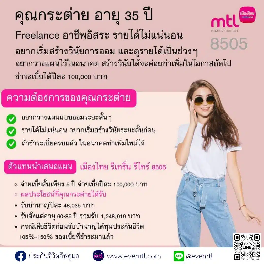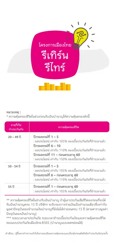โครงการเมืองไทย รีเทิร์น รีไทร์ 8505 (บำนาญลดหย่อนได้) ลดหย่อนได้ จ่ายเบี้ยสบาย รีไทร์อย่างร่ำรวย ลดหย่อนภาษีได้สูงสุด 300,000 บาท